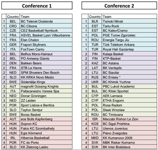 După cum anunță FIBA Europe s-au înscris 56 de echipe, acestea fiind împărțite în două conferințe egale în funcție de criteriul geografic. Cele două echipe românești au fost repartizate în conferința a doua, Energia fiind în prima urnă valorică, în timp ce bănățenii în cea de-a treia urnă. În continuare puteți consulta componența celor două serii cu mențiunea că BC Enisey va participa în această competiție doar dacă Rusia nu va mai fi suspendată de FIBA: