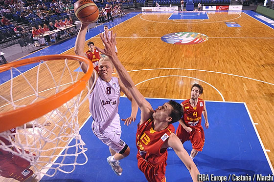 Pe final Spania a egalat la 62, însă Letonia a înscris două puncte. Daniel Diez, de departe cel mai valoros jucător al acestei echipe a Spaniei, a împărțit două libere irosind șansa de a egala. Urmează două aruncări de pedeapsă irosite de Letonia, iar Diez ratează ultima aruncare a meciului, una la disperare. Astfel, Letonia completează parcursul excelent de la turneul din țara vecină calificându-se în marea finală. Rezultatul final a fost de 64-63.