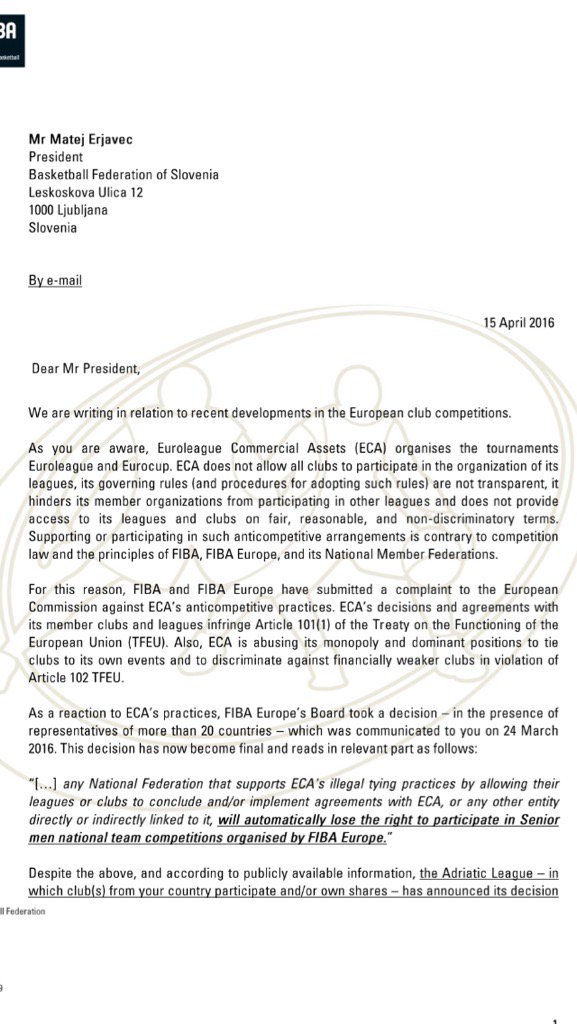 Document transmis de FIBA către președintele Federației de Baschet din Slovenia / Sursa: yugobasket