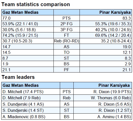 - Mediaș are nouă jucători cu medii de cel puțin 8.0 puncte pe meci în EuroChallenge. În schimb, Pinar are șase jucători cu peste opt puncte pe partidă.
