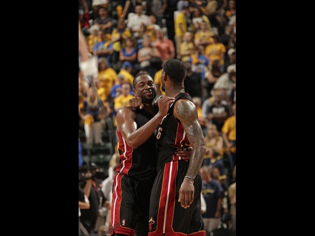 În cealaltă semifinală a Estului, Indiana îi face viață grea lui LeBron James și Dwyane Wade. Pacers a câștigat un meci în Miami și a avut un avantaj de 2-1, la general. D-Wade a făcut unul din cele mai slabe partide, din carieră, în meciul 3. El a înscris doar 5 puncte (2-13 FG) și și-a vărsat nervii pe antrenorul lui Miami Heat, Erik Spoelstra. Cei doi au avut o discuție aprinsă, preț de câteva secunde, în a 3-a repriză a meciului 3. După partidă, Wade a încercat să detensioneze atmosfera, spunând mediei americane: „Suntem o familie.” Și disputa a fost uitată, în cea de-a 4-a confruntare a semifinalei. După un început slab, Wade a marcat 22 din totalul de 30 de puncte, în a doua jumătate a întâlnirii. El și LeBron au înscris 70% din punctele lui Miami, în meciul 4, inclusiv 38 de puncte consecutive, pe o perioadă de 13 minute. James a avut o performanță istorică, în jocul de duminică seară: 40 de puncte; 18 recuperări; 9 pase decisive, 2 intercepții și 2 blocaje. „Am simțit că trebuie să fac orice ca să câștigăm”, a spus „Regele”, la final.