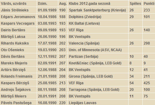 Lista jucătorilor, cu data nașterii, înălțime, clubul la care este legitimat, numărul de selecții și de puncte înscrise în echipa naționale de seniori a Letoniei, este prezentată mai jos: