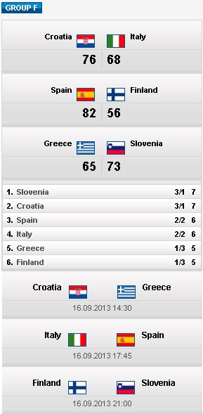 Luni (16.09) este ultima zi a fazei a doua de la Campionatul European de baschet masculin - ediția 2013. Dacă jocurile din Grupa E s-au încheiat duminică (15.09), în prima zi a noii săptămâni se vor disputa ultimele trei jocuri ale Grupei F.