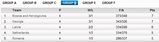 În momentul de față, Georgia și Bosnia-Herțegovina au câte trei victorii și o înfrângere. Departajarea, în caz de egalitate la încheierea tuturor meciurilor din grupă, se va face pe baza rezultatului direct consemnat, iar în acest moment beneficiară este Georgia, formație ce s-a impus cu scorul de 96-95, chiar la Sarajevo.