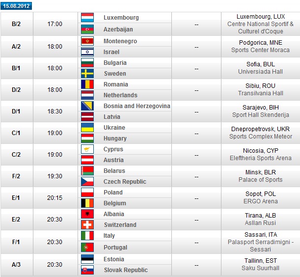 4 ani în urmăPrima rundă de meciuri în campania de calificare pentru EuroBasket 2013 se va desfășura miercuri (15.08). Cu excepția meciului dintre Islanda și Serbia, desfășurat marți (14.08), la mijlocul săptămânii sunt programate toate partidele etapei de debut. Programul meciurilor este afișat mai jos.
