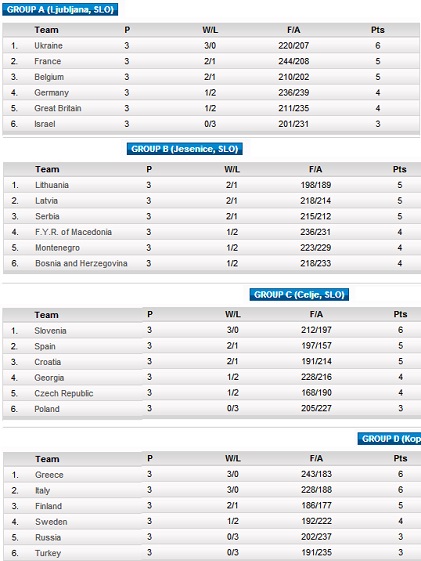Acestea sunt Ucraina, Slovenia, Grecia și Italia. Ele sunt singurele echipe rămase neînvinse la acest turneu. Între timp, sunt patru echipe rămase fără victorie. Acestea sunt Israel, Polonia, Rusia și Turcia. Fiecare dintre cele patru păstrează șanse matematice de calificare, însă din punct de vedere al realismului acestea sunt aproape de eliminare.