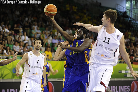 După revenirea de la cabine, jocul nu a avut răsturnări de situație, Ucraina rămânând la cârma partidei. Scorul după 30 de minute de joc era 57-64. În sfertul decisiv, Germania a reușit să preia conducerea cu trei minute și jumătate de joc rămase, însă Ucraina s-a impus cu scorul de 83-88.