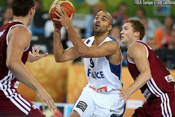 Primul sfert a fost un galop de sănătate pentru ofensiva franceza care ridiculizat complet Letonia. Balticii, care au demonstrat că au potență ofensivă, nu au ținut pasul și primul act s-a încheiat cu scorul 31-15. Sfertul secund nu a adus o schimbare în cursul jocului. Diferența nu s-a majorat însă pe tabelă, și la pauză, în sala din Ljublijana tabele indica scorul 52-53.