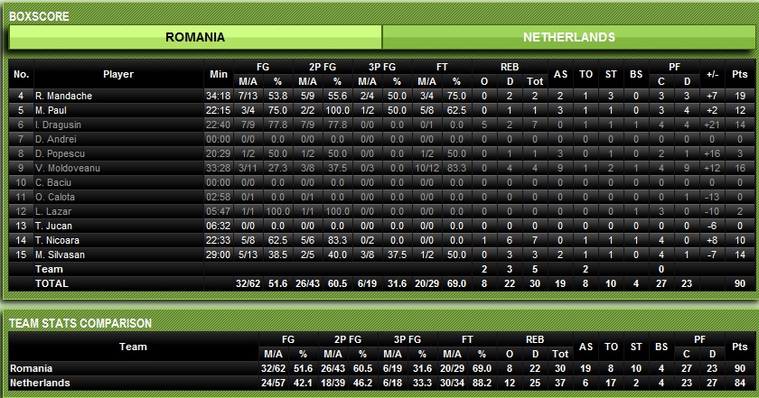 Paul ratează două libere, însă și batavii irosesc din afara semicercului. Apoi Miță transformă de două ori și mărește diferența la cinci puncte. Jansen și Akerboom taie din diferență, dar Vlad Moldoveanu este sigur la linia de pedeapsă. Rezultatul final a fost stabilit de către Mihai Paul, de la linia de pedeapsă, meciul terminându-se cu scorul de 90-84.