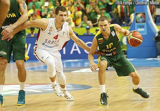 Prima reușită a meciului a venit abia după un minut după ce sârbul Bogdan Bogdanovic a plantat o triplă. După un alt minut Nenad Krstic făcea 5-0. Seibutis a punctat primul pentru Lituania de la mare distanță după 2 minute și 15 secunde. Serbia a trecut la cârma jocului, iar jucătorii lui Dusan Ivkovic s-au distanțat. Până la finalul primului act, Krstic, Nedovic și Bjelica au dus scorul la 20-10, balticii găsind foarte greu drumul spre coșul adversar. Actul secund a început la fel de bine cum s-a încheiat pentru sârbi. Au reușit să-și mărească avantajul chiar și la 14 puncte în debutul sfertului. Kalnietis și Seibutis au fost cei care au dat semne pentru Lituania că ar exista pe parchet iar în a doua jumătate a meciului balticii au revenit. Pivotul lituanian, Darjus Lavrinovic stabilea scorul pauzei, 33-27 în favoarea Serbiei.