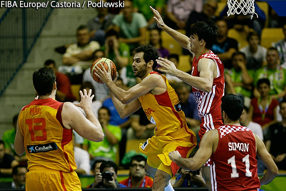 Spania a început partida fulminant, transformând în scurt timp un deficit de două puncte (3-5) într-un avans de 13 puncte (18-5). Defensiva iberică a fost impenetrabilă în primul sfert, Croaţia nereuşind să înscrie niciun punct timp de mai mult de 7 minute. Spania a terminat sfertul cu un avans de 15 puncte, scor 24-9. Croaţii au avut un procentaj îngrozitor la aruncările de 3 puncte, 2/17, iar singurul jucător care a ieşit în evidenţă a fost Bogdan Bogdanovic cu 12 puncte şi 7 recuperări. Prin această victorie Spania nu doar că a înregistrat una dintre cele mai confortabile succese, dar a şi trimis un mesaj despre intenţiile lor în Slovenia, arătând faptul că ei sunt echipa de bătut a acestui european.