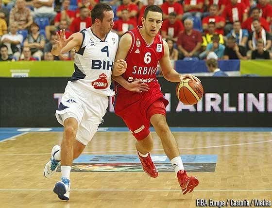 Foste componente ale blocului iugoslav cele două țări disputau un meci cu în care și rivalitatea și-a putut face loc. Mirza Teletovic a început partida excelent și ducea Bosnia în avantaj, 8-4, după 3 minute de joc. Exact la mijlocul sfertului inaugural, sârbii treceau la conducere, 10-11, după tripla lui Stefan Markovic. A fost momentul în care jocul s-a rupt. Agresivi în defensivă și foarte inspirați în atac sârbii au încheiat sfertul cu scorul de 16-28. Sfertul doi a fost unul cu un istoric sec și în favoarea sârbilor. Aceștia și mărit avantajul și la 18 puncte. Djedovic a avut câteva răbufniri dar prima repriză s-a încheiat cu scorul 31-45.