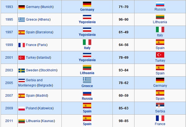 EuroBasket - Lista ultimelor zece finale