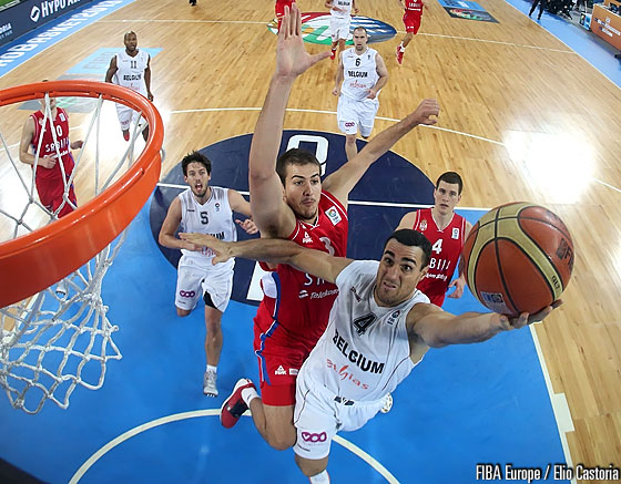 În debutul partidei sârbii au fost luați complet prin surprindere. După 3 minute de joc Belgia avea un avantaj de 8-0, Mukubu cu 2 coșuri marcate, respectiv Van Rossom și Massot cu câte unul. Bjelica marca primele puncte pentru Serbia, din spatele liniei de 3 puncte. Sârbii au reușit să echilibreze partida iar finalul sfertului le-au aparţinut. Cu 3 minute înainte finalului primului act scorul era 15-10 în favoarea belgienilor. Stefan Markovic cu 7 puncte și Nemanja Bjelica cu 2, au răsturnat situația. Astfel scorul primului act s-a terminat cu scorul 18-19. Ex-iugoslavii au început în forță în sfertul secund. După 12 minute trecute din partide Serbia avea 7 puncte avans, 18-25. Totuși sârbii nu au menținut acest forcing pentru mult timp. Puțin după jumătatea actului secund scorul era egal, 30-30 după o liberă transformată de belgianul Beghin. Până la pauză s-a mers cap la cap, dar Kalinic marca înainte de ultima sirenă a primei secvențe și stabilea scorul pauzei 36-40.