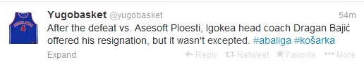 Potrivit presei ex-iugoslave, Dragan Bajic, antrenorul principal de la Igokea Aleksandrovac, și-a prezentat demisia din funcție după eșecul suferit în propriul fief pe mâna lui CSU Asesoft Ploiești, în etapa a 3-a din sezonul regulat al EuroCup.