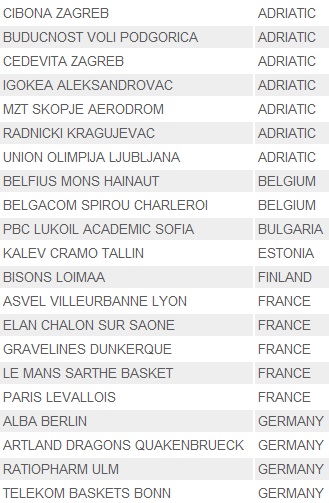 Lista de mai sus cuprinde cluburi din 21 de țări, printre care se numără și zece campioane naționale (inclusiv cea a Rmâniei). De asemenea, întâlnim trei câștigătoare ale EuroCup, respectiv două finaliste ale acestei competiții.