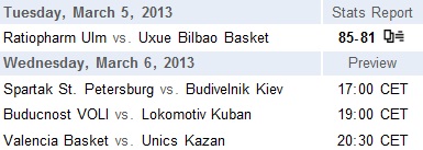 Ratiopharm Ulm a depășit pe UXUE Bilbao, scor 85-81, în primul meci din playoff-ul EuroCup - ediția 2012/13. Partida a avut loc în cursul serii de marți (05.03), în Germania.