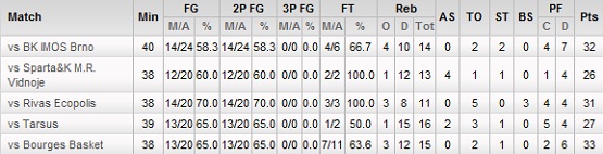 Linia statistică a Tinei Charles în partidele disputate în acest sezon de Euroligă: