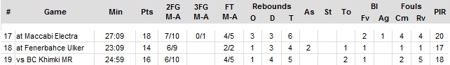 Barcelona a întâlnit și înving pe Maccabi Tel-Aviv, Fenerbahce Istanbul (ambele în deplasare), respectiv Khimki Moscova (pe teren propriu), în perioada în care Tomic a fost cel mai bun jucător al ligii. Iată linia statistică a jucătorului de 2.17 metri în cele trei partide: