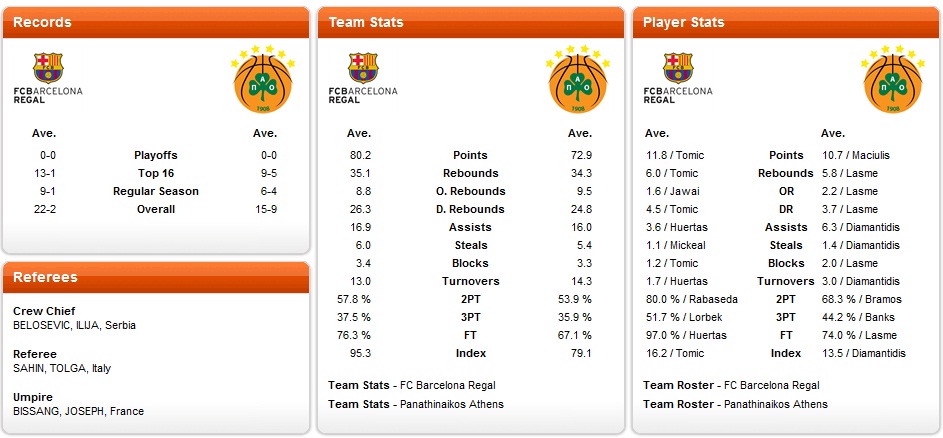 De cealaltă parte, Panathinaikos nu mai este acea echipă din perioada 1999-2012. Totuși, la primul sezon fără Zeljko Obradovic, precum și fără 90% din jucătorii care au alcătuit lotul în urmă cu un an, Panathinaikos a pătruns în playoff. Valoric echipa nu strălucește, însă este condusă din teren de cel mai echilibrat jucător de pozițiile 1-2-3 din Europa, Dimitris Diamantidis.