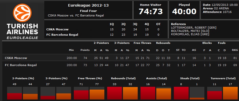 CSKA Moscova a învins pe FC Barcelona Regal, scor 74-73, în finala mică a Euroligii masculine de baschet - edița 2012/13. Partida a avut loc la The O2 Arena, din Londra, în cursul serii de duminică, în deschiderea marii finale.