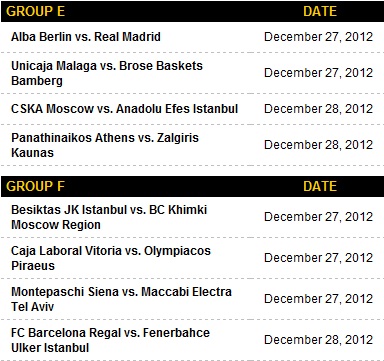 4 ani în urmăTOP 16, faza a doua a grupelor din Euroliga masculină - ediția 2012/13, este programată să înceapă în cursul serii de joi (27.12). Iată programul rundei inaugurale: