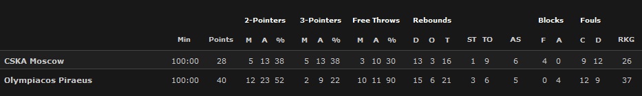CSKA - Khryapa 9 puncte, 3 recuperări, Weems 8 puncte. Teodosic are 0/5 la aruncările din acțiune și 0/2 la libere cu -3 la eficiență în 16 minute pe parchet.