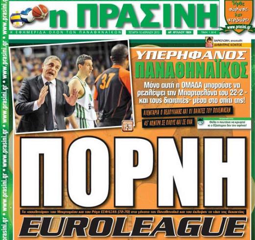 În dimineața zilei de miercuri (10.04), ziarul deținut de către președintele lui Panathinaikos a titrat chiar pe prima pagină cu litere mari: "târfă" făcând referire directă la Euroleague Basketball și insinuând că la nivel de conducere cea mai importantă competiție baschetbalistică din Europa este aservită cluburilor cluburilor iberice și lui CSKA Moscova.