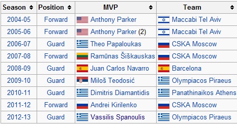 Precedenții câștigători ai titlului de MVP al sezonului în Euroliga masculină: