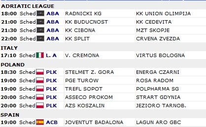 În schimb, în Italia este programat tot un meci. Vanoli Cremona primelte replica lui Virtus Bologna. Celelalte partide ale primei etape din sezonul regulat sunt programate pentru duminică (30.09). De notat că la mijlocul acestei săptămâni s-a disputat un meci în devans, contând pentru etapa a 2-a din campionatul italian. Montepaschi Siena a trecut de Enel Brindisi, scor 92-65.