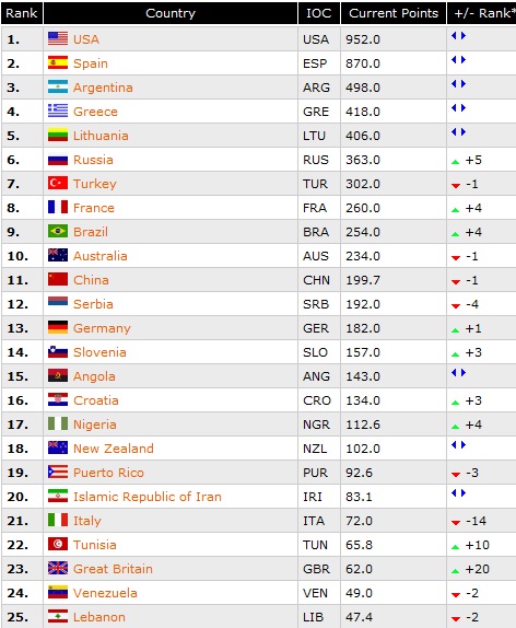 4 ani în urmăStatele Unite ale Americii și-au consolidat prima poziția în ierarhia FIBA ca urmare a triumfului consemnat la Jocurile Olimpice de la Londra. De asemenea, Spania și-a întărit poziția secundă în clasament, având un avantaj de aproape 400 puncte în fața celei de-a 3-a clasate, Argentina, în condițiile în care pentru câștigarea unui concurs precum cel recent încheiat în Marea Britanie se acordă 50 de puncte.