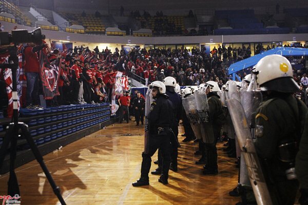 În plus, un suporter al lui Olympiacos a pătruns în zona VIP a sălii în care se dispută finala, și-a scos cureaua de la pantaloni și a început să lovească spectatorii prezenți în această zonă. Se pare că aceștia ar fi arătat semne obscene zonei în care sunt poziționați susținătorii campioanei Greciei și ai Europei.