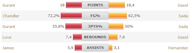 Liderii din punct de vedere statistic ai celor două echipe în cadrul turneului olimpic de baschet masculin de la Londra sunt următorii:
