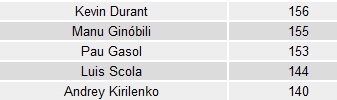 În schimb, Kevin Durant a fost jucătorul cu cele mai multe puncte înscrise în concursul de baschet masculin de la Jocurile Olimpice. El i-a devansat la limită pe Manu Ginobili și pe Pau Gasol.