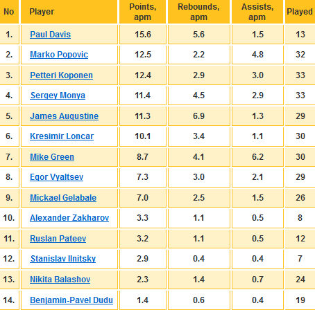 Succesul lui Khimki din acest sezon este unul ușor de explicat uitându-ne pe statistica echipei. În lotul rușilor există 6 jucători care au medii de peste 10 puncte pe meci, în timp ce alții 3 strâng în fiecare meci peste 5 puncte. Faptul că punctele se împart foarte bine în echipa rusă demonstrează jocul bun de echipă și coeziune lotului. Mai jos este prezentat un tabel cu performanțele individuale ale jucătorilor lui Khimki: