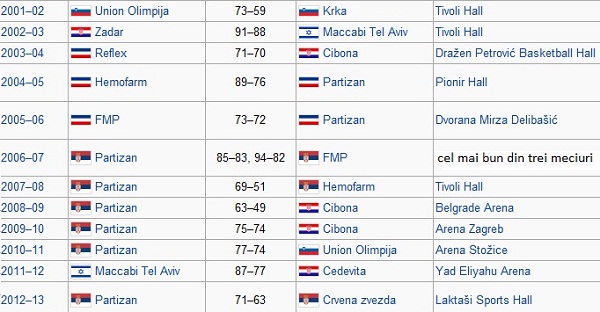 Echipa antrenată de către Dusko Vujosevic este secondată de către FMP Zeleznik (Reflex), la numărul de trofee adjudecate, cu două titluri. Câte un trofeu au câștigat și Olimpija Ljubljana, KK Zadar, Hemofarm Vrsac și Maccabi Tel-Aviv.