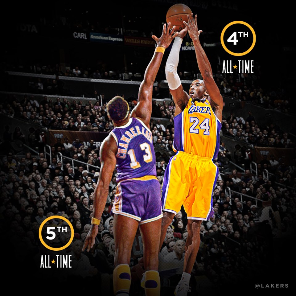 Bryant a depășit pragul de 31.419 puncte, marcate de către Wilt Chamberlain și a urcat pe locul al 4-lea în această listă. El este devansat de către Kareem Abdul-Jabbar, Karl Malone și Michael Jordan.