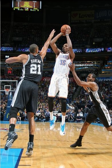 Pintenii au câștigat primele două secvențe, ambele la limită, astfel încât după 24 minute de joc efectiv tabela de marcaj indica scorul de 46-43 în favoarea vizitatorilor. Lucrurile s-au schimbat în repriza a doua. OKC a izbutit un parțial de 25-15 în următoarele 12 minute de joc, preluând conducerea pe tabela de marcaj, pe care nu au mai cedat-o până la finalul jocului. Spurs au avut un parțial de 9-1 undeva la jumătatea secvenței decisive pentru a se apropia la trei puncte, însă acesta a fost urmat de un interval de aproximativ patru minute în care aceeași echipă nu a punctat din acțiune. Astfel, Kevin Durant a desprins decisiv echipa din Oklahoma City.