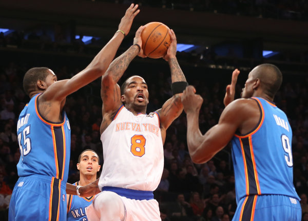Noaptea de joi spre vineri a programat două partide, unul din acestea disputându-se la Madison Square Garden unde echipa gazdă New York Knicks primea vizita celor de la Oklahoma City Thunder. Vedeta echipei din Manhattan, Carmelo Anthony continuă să absenteze de pe parchet datorită unor probleme medicale. În luna martie echipa lui Mike Woodson avea un parcurs foarte mulțumitor, ei reușind 4 victori în 5 meciuri, însă acea înfrângere a venit în fața campioanei en-titre Miami Heat. Oaspeții venea după o partidă excelentă pe teren propriu în care i-au surclasat pe cei de Los Angeles Lakers și au egalat un record NBA cu doar 2 turnovers în acel meci. Knicks ocupa poziția a 2-a în Est la fel ca și Thunder în Vest doar că New York-ezii aveau un record de 37-21 pe când oaspeții se mândreau cu un record de 44-16.