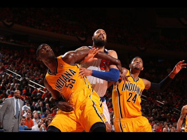 Frank Vogel antrenorul Indianei a găsit tactica perfectă pentru a-l apăra pe Carmelo, mereu forțat să arunce peste adversarii săi care-l flancau foarte aproape. În ciuda celor 27 de puncte vedeta gazdelor, Carmelo Anthony nu a fost foarte productiv el marcând din acțiune abia 10 aruncări din 28 de încercări și 1 din 4 de la mare distanță. Efortul colectiv a fost factorul determinant pentru Indiana Pacers, toți cei cinci titulari marcând peste 10 puncte: David West 20, Paul George 19, George Hill 14, Roy Hibbert 14 și Lance Stephenson 11. Tyler Hansbrough cu 8 și D.J Augustin cu 16 puncte au fost cei care au completat lista marcatorilor pentru oaspeții din această seară. Fără Danny Granger aproape tot sezonul, așa numitul urmaș al lui Reggie Miller, Pacers are un parcurs excelent și acum poate încheia seria câștigându-și toate meciurile de acasă. După prima partidă preconizez că seria se va încheia doar după cel puțin 6 partide însă presiune care se află acum pe echipa din New York poate sfărâma pronosticul meu. Meciul 2 se va juca tot la New York dar încă șefii NBA nu au decis data confruntării.