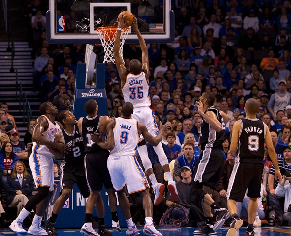 Chesapeake Energy Arena, din Oklahoma a fost gazda unui meci extrem de important, care a pus față în față echipele care conduc Conferința de Vest, Oklahoma City Thunder și San Antonio Spurs. Gazdele aveau șansa de a administra cea de-a 20-a înfrângere stagională adversarei din Texas, același număr de înfrângeri pe care l-au înregistrat și ei în sezonul curent. Echipa lui Gregg Popovich suferă de mai bine de o lună de zile din cauza accidentărilor oamenilor de bază, Tony Parker a fost nevoit să stea departe de parchet 4 săptămâni, Tim Duncan a avut și el o ușoară problemă de sănătate iar acum Manu Ginobili și Stephen Jackson erau indisponibili pentru Spurs.