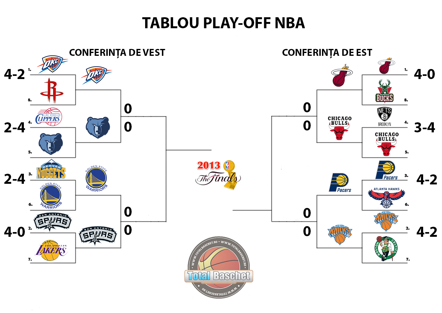Turul al doilea în playoff-ul NBA demarează în cursul serii de duminică (05.05). În seara Paștelui ortodox, baschetul profesionist nord-american își îndreaptă atenția spre următoarea fază în cursa pentru stabilirea campioanei 2013.
