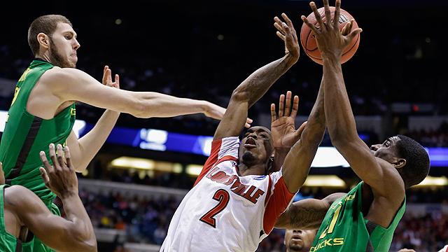 Louisville Cardinals și Oregon Ducks s-au întâlnit în prima semifinală a Regiunii Midwest. Cotată cu prima șansă în regiune, Louisville s-a impus cu 77-69 și a ajuns la 14 victorii consecutive în NCAA. Deși vedeta echipei, Peyton Siva, a jucat doar 19 minute și a avut 4 puncte și 3 recuperări, Louisville și-a găsit omul-cheie în persoana lui Russ Smith. Acesta a terminat partida cu 31 de puncte, 14 dintre acestea venind din aruncările libere. Kevin Ware a marcat și el 11 puncte pentru Cardinals. Oregon a replicat prin E.J. Singler, autor a 15 puncte și 6 recuperări.