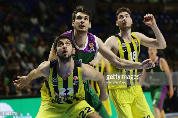 Rareș Uță (verde), într-un meci din Euroliga masculină contra lui Fenerbahce