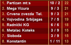 Într-un alt meci Radnicki Kragujevac a învins Vojvodina, la NoviSad, scor 85-78, pentru a menține deschisă lupta pentru locul 4 la încheierea fazei a doua. Partizan s-a impus la Valjevo, scor 88-62.