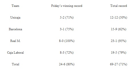 Lista de mai jos evidențiază faptul că Real Madrid, FC Barcelona Regal și Unicaja Malaga au un procentaj de succes mai mare decât media stagională atunci când în serile de vineri joacă la nivel de Euroligă, iar apoi la mai puțin de 48 ore joacă un meci de campionat. Lucru extrem de interesant în condițiile în care Spania este cotată de departe ca fiind țara cu cel mai puternic campionat intern din Europa.