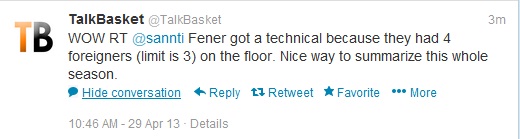 Concret, este vorba despre decizia, sau greșeala, antrenorului lui Fener de a juca cu patru străini în același timp. Potrivit regulamentului în vigoare în campionatul din Turcia acest lucru nu este regulamentar. O echipă din TBL (Turkish Basketball League) este obligată să joace în permanență cu cel puțin doi jucători autohtoni. Drept urmare, decizia arbitrilor a fost de a sancționa echipa galben-albastră cu un fault tehnic. Așa cum este prevăzut în regulamentul specific al competiției.