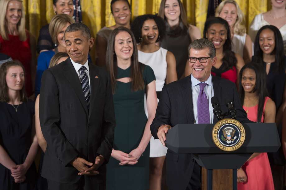 Fetele pregătite de Geno Auriemma, cel mai titrat antrenor feminin al momentului peste Ocean, nu au ratat niciun an din ultimul mandat al președintelui SUA, fiind de fiecare dată prezente la recepția preşedinţiei.