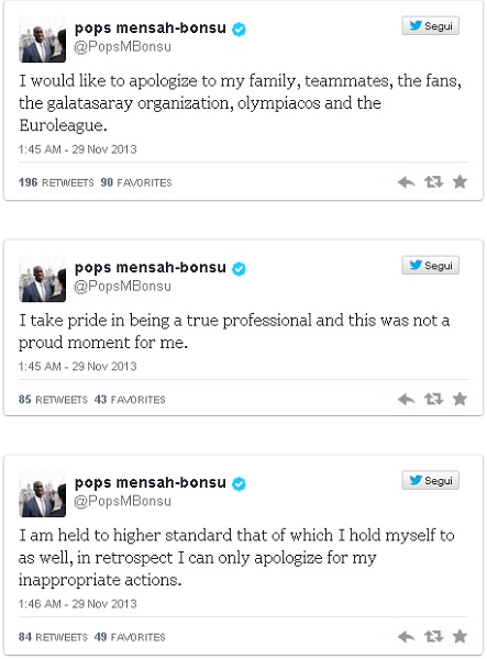 Pops Mensah Bonsu, pivotul britanic al echipei Galatasaray Istanbul, și-a cerut scuze și a menționat că regretă incidentele în care a fost implicat spre finalul partidei de Euroligă pierdută pe terenul lui Olympiacos Pireu.