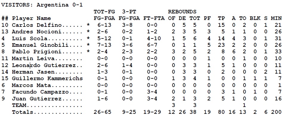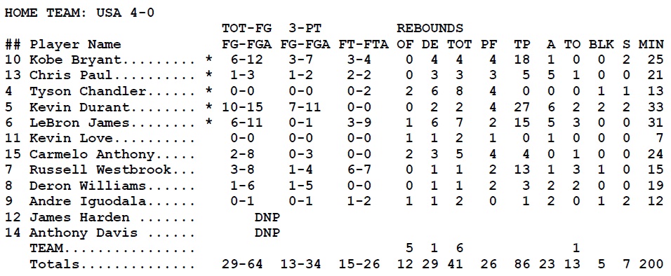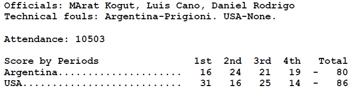 Rezumatul meciului dintre Statele Unite ale Americii și Argentina, desfășurat la Palau Sant Jordi din Barcelona și încheiat cu scorul de 86-80: